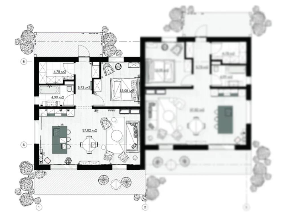 Virtuvės-svetainės panoraminės įstiklintos durys veda į erdvią terasą, kurioje galima įsirengti gultus ir vasaros valgomojo zoną su kepsnine, rengti šiltus susitikimus su draugais ir šeima bei mėgautis kasdieniu poilsiu lauke.